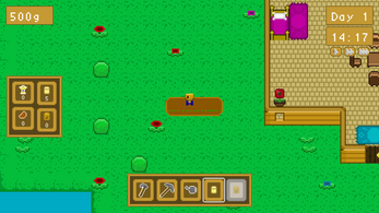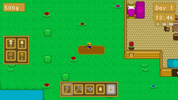 The Hoe is the first tool, and allows you to till the ground and harvest fully grown crops. It also allows you to break bushes.